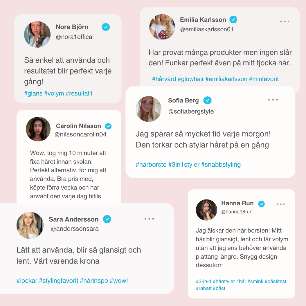 “Jag brukar inte skriva recensioner, men den här förtjänar verkligen ett beröm! Så enkel att använda, även för någon som mig som inte är proffs på styling. Jag får mjukt, följsamt hår på 10 minuter