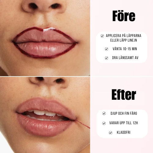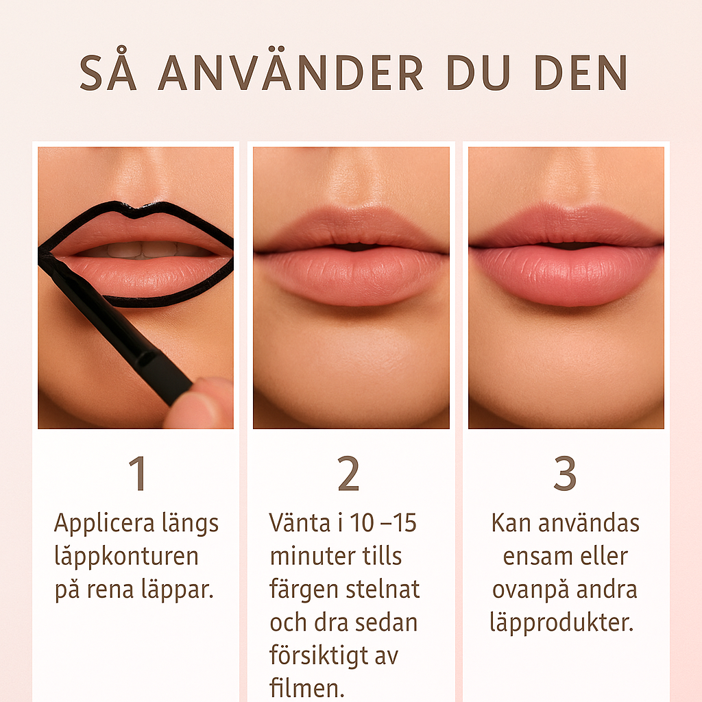 Applicera ett jämnt lager på rena och torra läppar – antingen som kontur eller över hela läppen. Låt produkten torka i 10–15 minuter tills den känns fast. Dra sedan försiktigt bort färgfilmen från kanten. Dina läppar får en vacker, naturlig färgton som håller hela dagen!